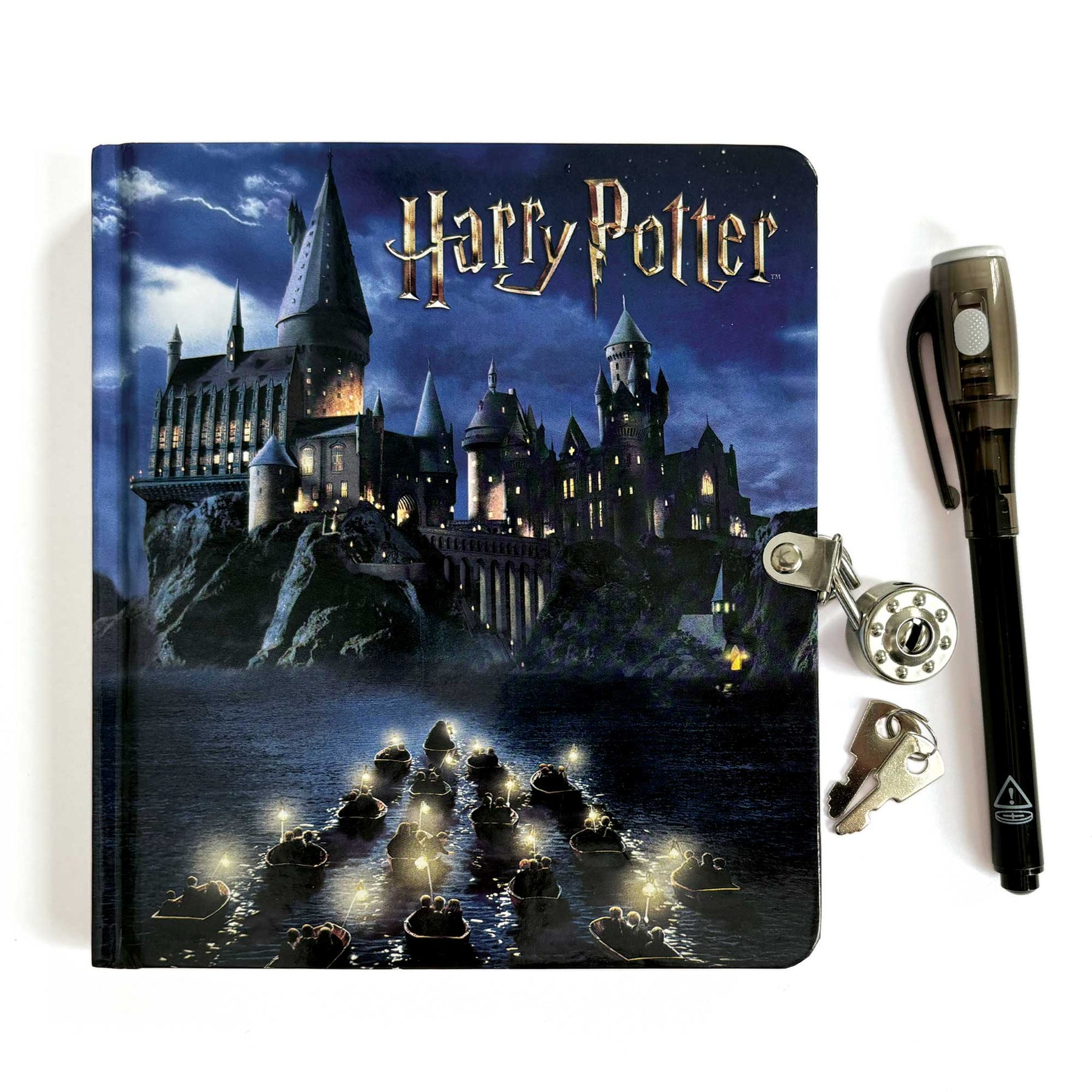 This officially licensed Harry Potter Locking Diary shows the dramatic moment that Harry and his friends first catch a glimpse of the Hogwarts castle. Their magical home for the next seven years! It is made even more fun with the included invisible ink pen. Write down all of your secrets and they can only be revealed by shining the special light!